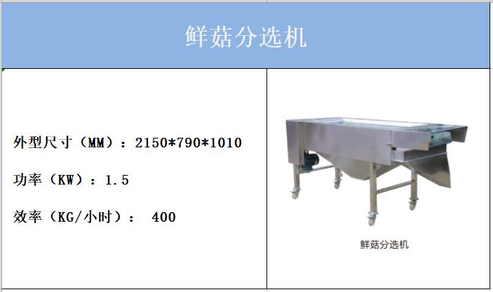 逸村鮮菇篩選機(jī)設(shè)為2層,即2層篩網(wǎng),外形尺寸:2150*790*1010mm,功率:1.5kw,工作效率可達(dá)400kg/小時(shí)。