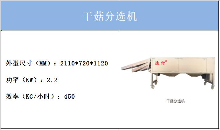 逸村干菇篩選機(jī)設(shè)為4層,即4層篩網(wǎng),外形尺寸:2110*720*1120mm,干菇機(jī)功率相對于鮮菇機(jī)要搞,功率2.2kw,工作效率達(dá)450kg/小時(shí)。